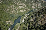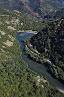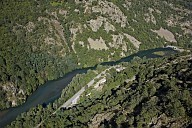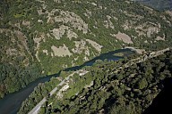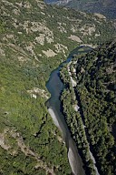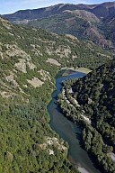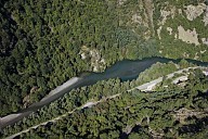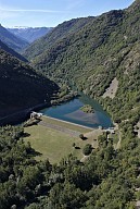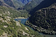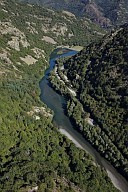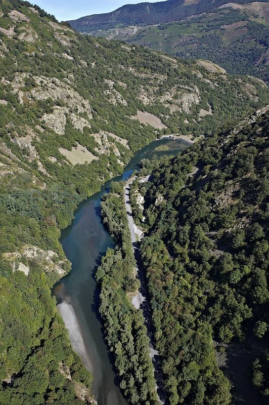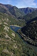 Vue aérienne de la Garonne en amont du lac de retenue du plan d'Arem à Fos en Haute-Garonne