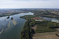 Vue aérienne des vergers au niveau de la confluence du Tarn et de la Garonne en amont du plan d'eau de Saint-Nicolas-de-la-Grave en Tarn-et-Garonne