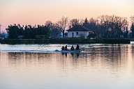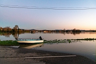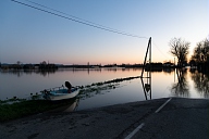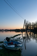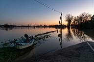 Embarcation pour le transport de personnes dans le quartier Saint-Germain inondé au niveau de de la D120 en rive gauche de la Garonne face à Tonneins en Lot-et-Garonne pendant la crue de la Garonne -12 janvier 2022